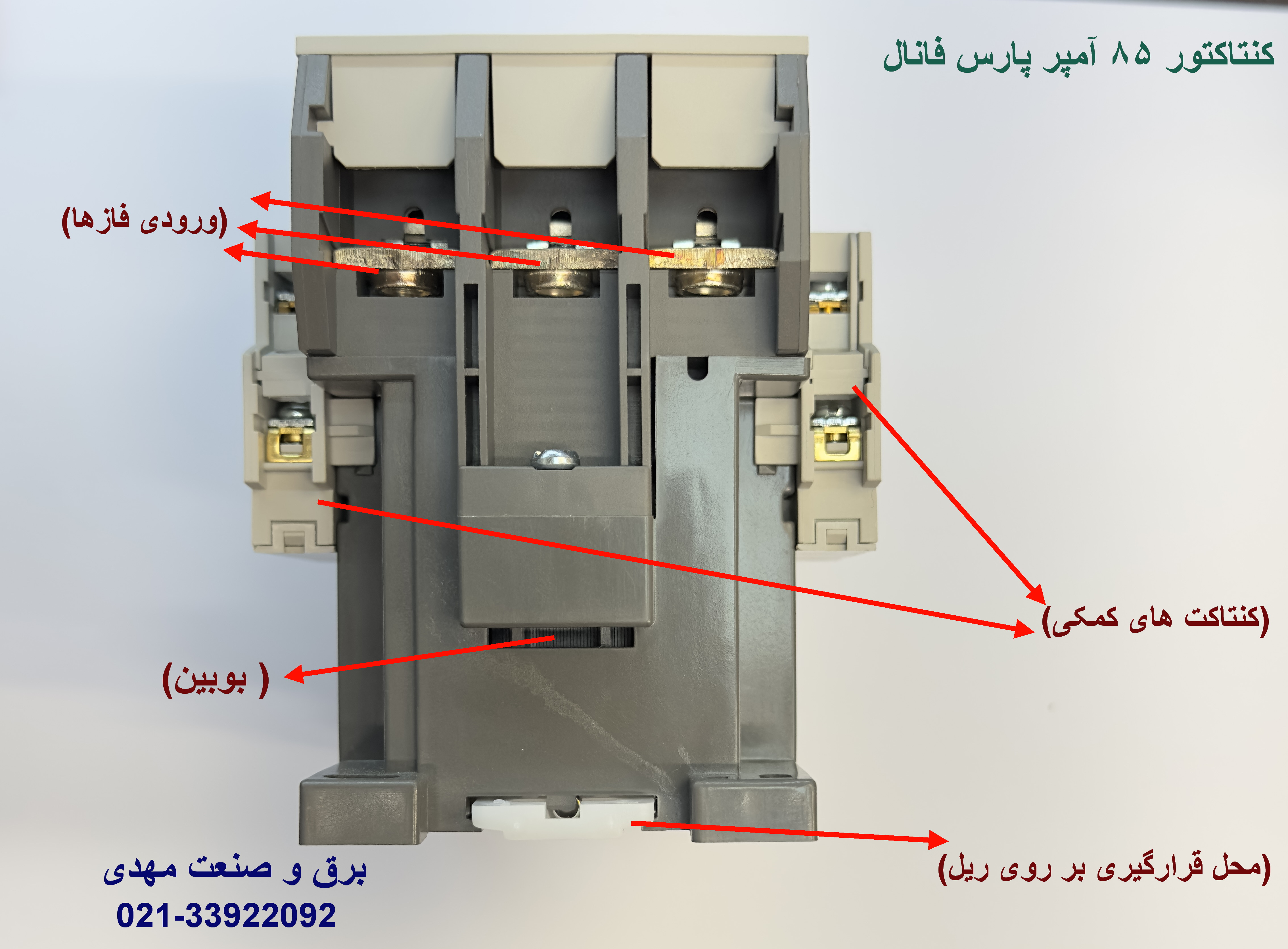 کنتاکتور 85 آمپر پارس فانال دارای 3 ورودی فاز و 3 خروجی فاز میباشد، در دوطرف این کنتاکتور 2 کمکی جایگذاری شده است که هر کدام داری یک تیغه باز و یک تیغه بسته میباشند،بوبین این کنتاکتور قابل تعویض بوده که در قسمت زیرین کنتاکتور قرار دارد،قسمت انتهایی این کنتاکتور بر روی ریل قرار میگیرد اما 4 سوراخ نیز در این محل تعبیه شده تا این محصول بر روی پایه یا تابلو پیچ شود.